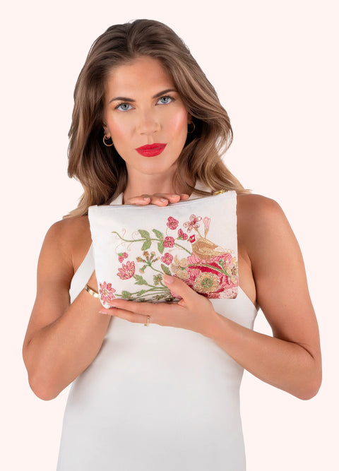 Our NEW mid-sized zip pouch is gorgeously hand-embroidered on velvet and will have you daydreaming of a peaceful wildflower garden surrounded by friends in the soothing summer sunshine. Perfect for travelling or to add a splash of luxury to your everyday. Carry down to evening drinks or keep in your hand luggage as an organizer. Go on, shop now!